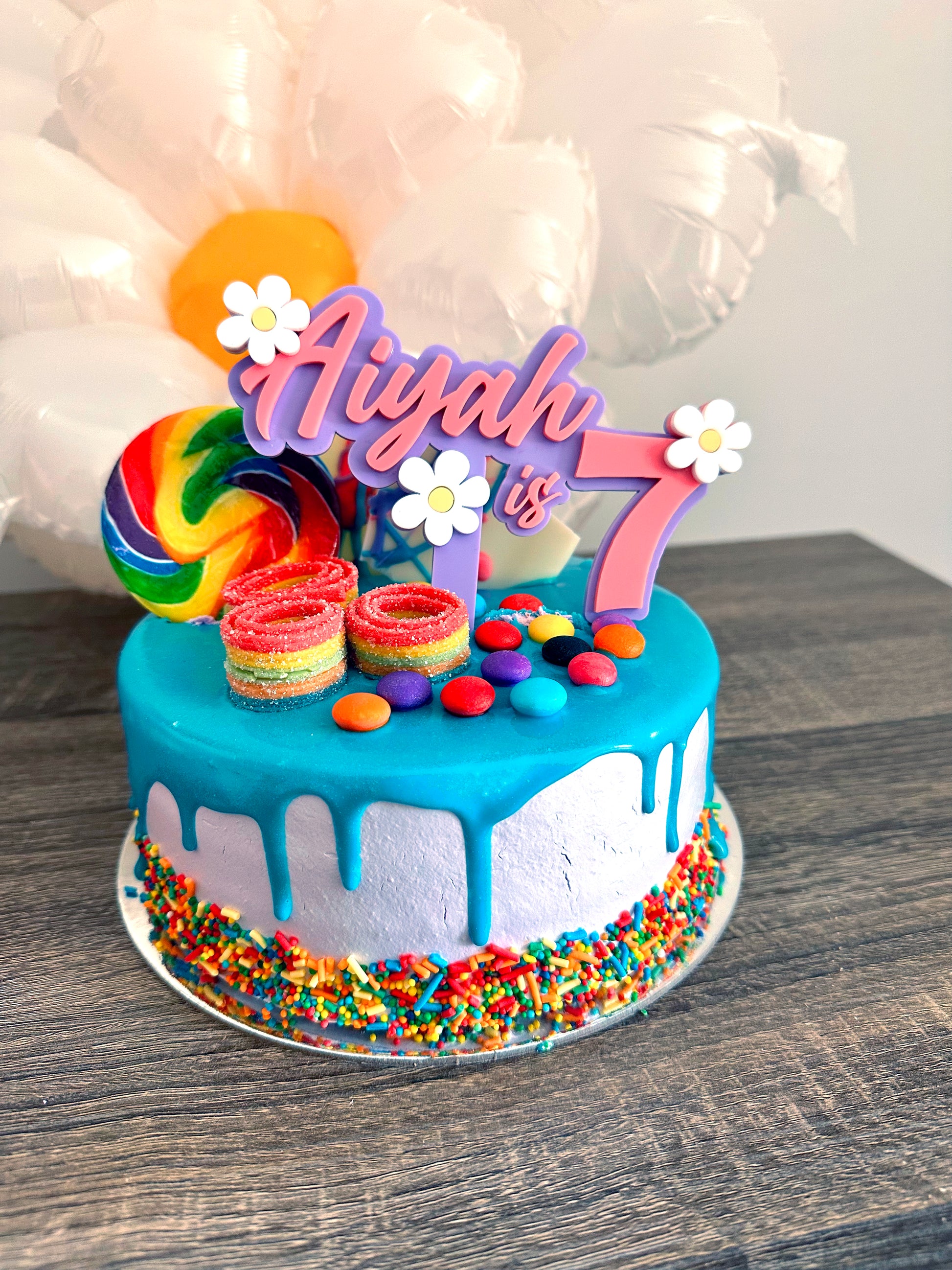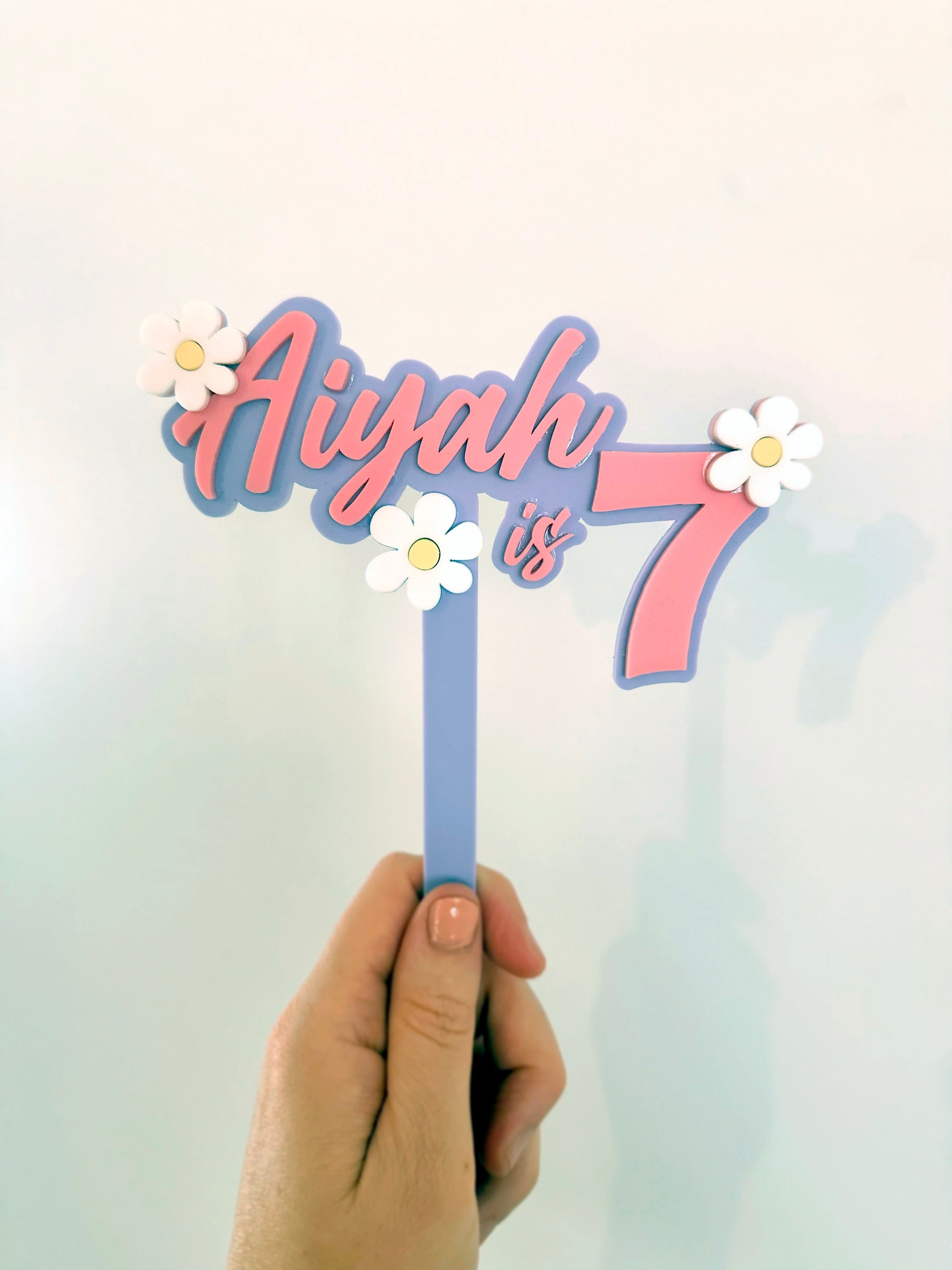 Our cute double layered birthday topper with personalised name and age with added daisy flowers.