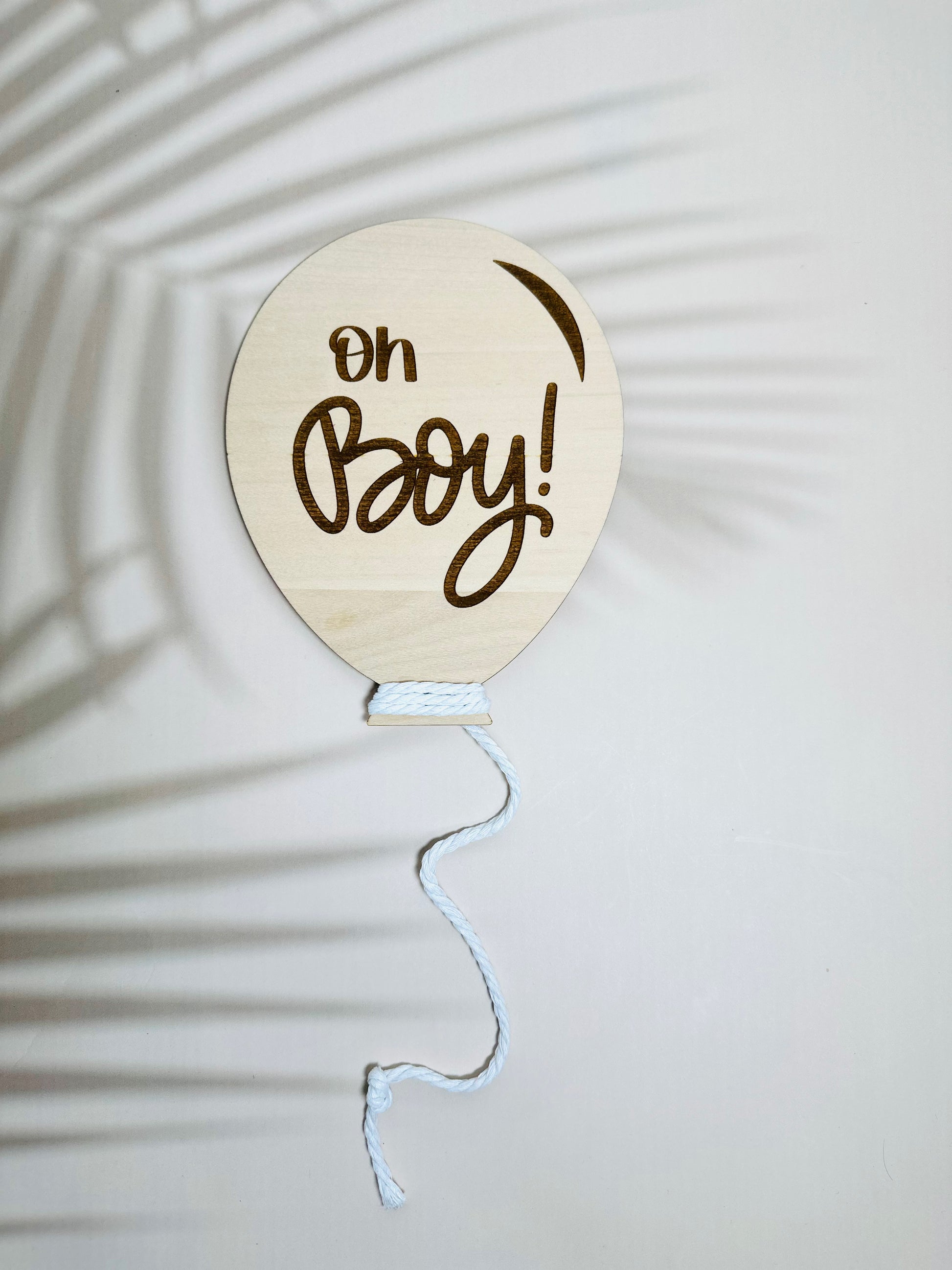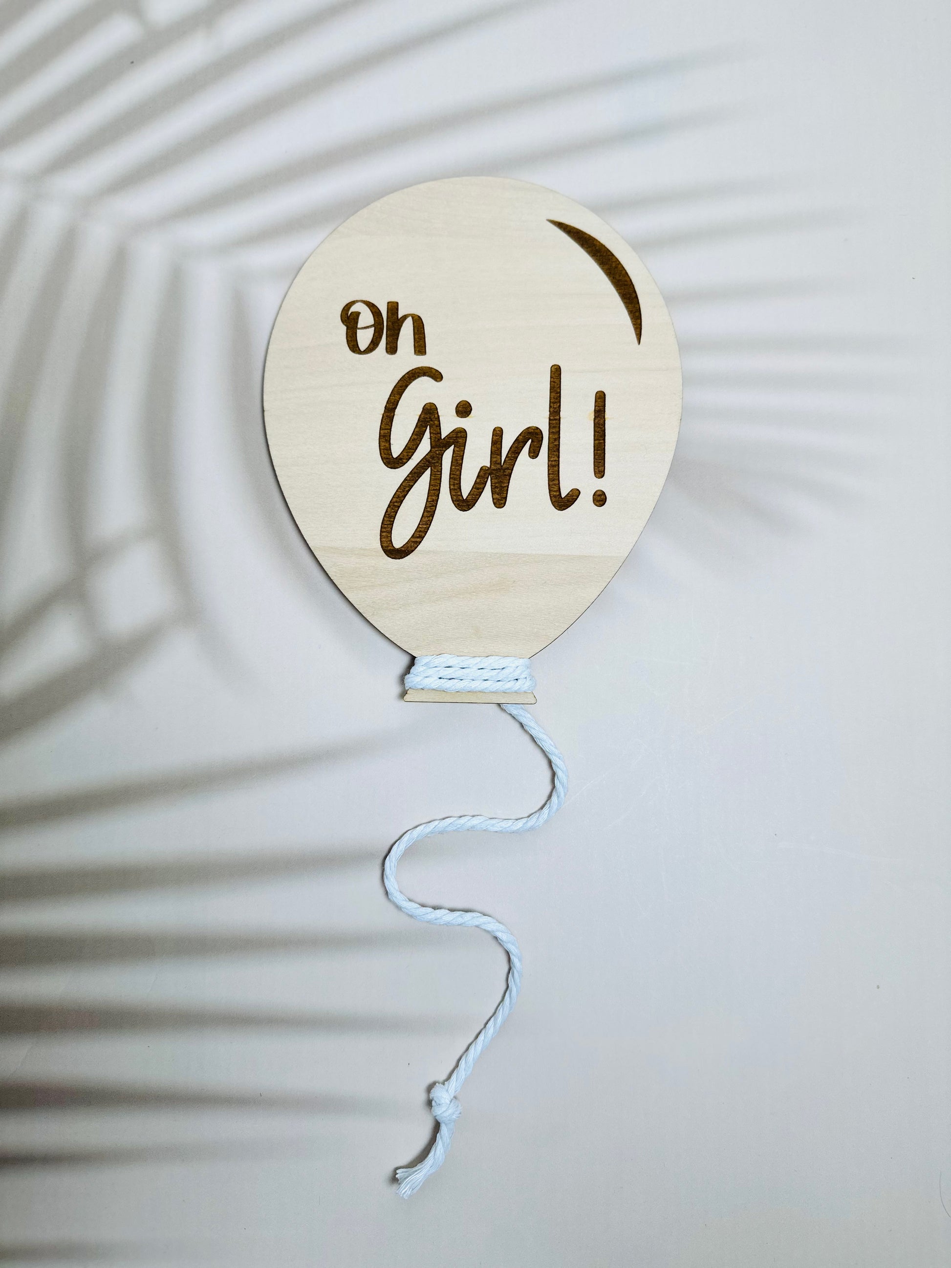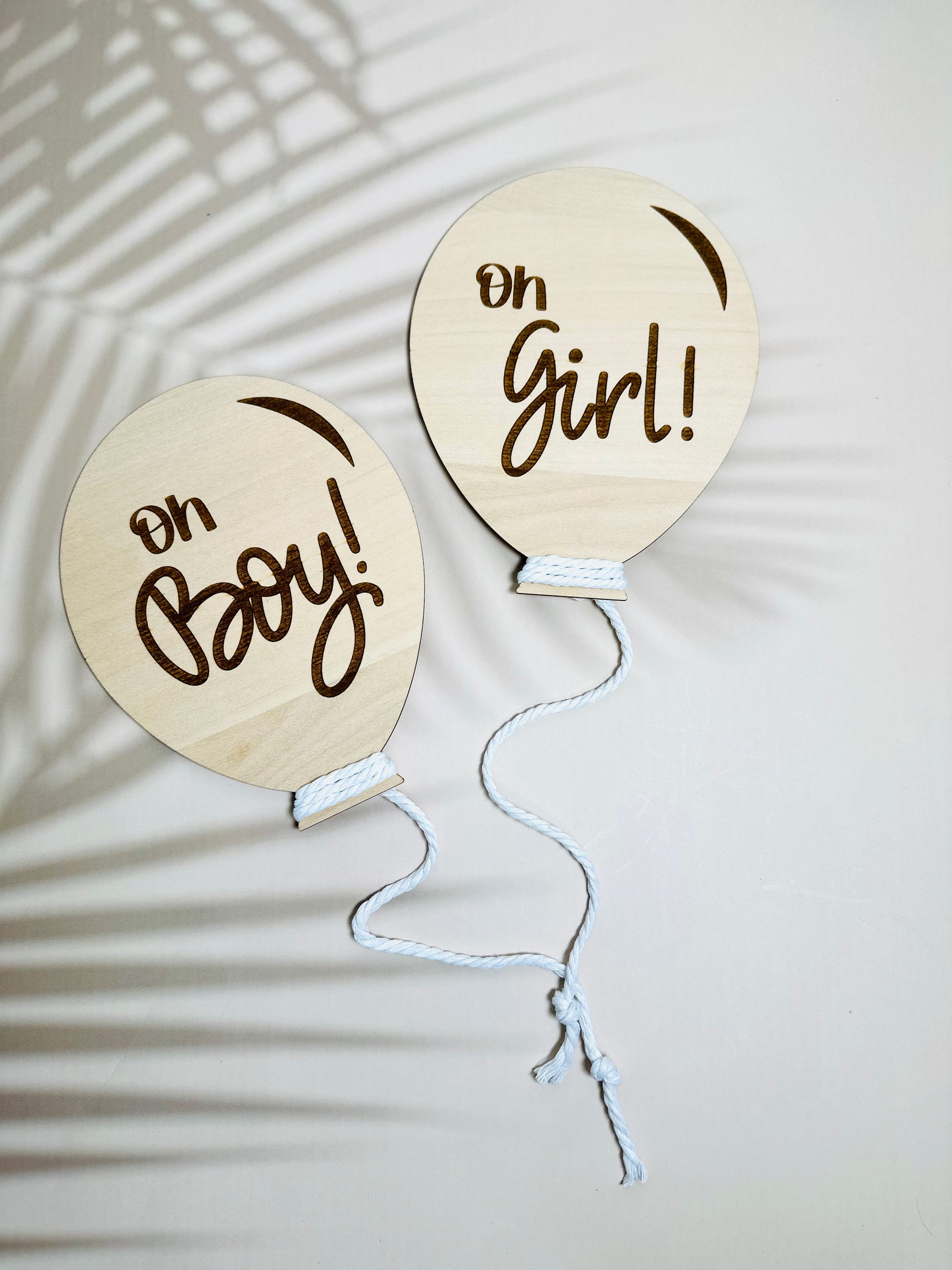 Available in two options of either "Boy" or "Girl" and engraved on quality pine. White rope twine is added for effect and the balloons measure 150mm x 195mm plus the rope twine.