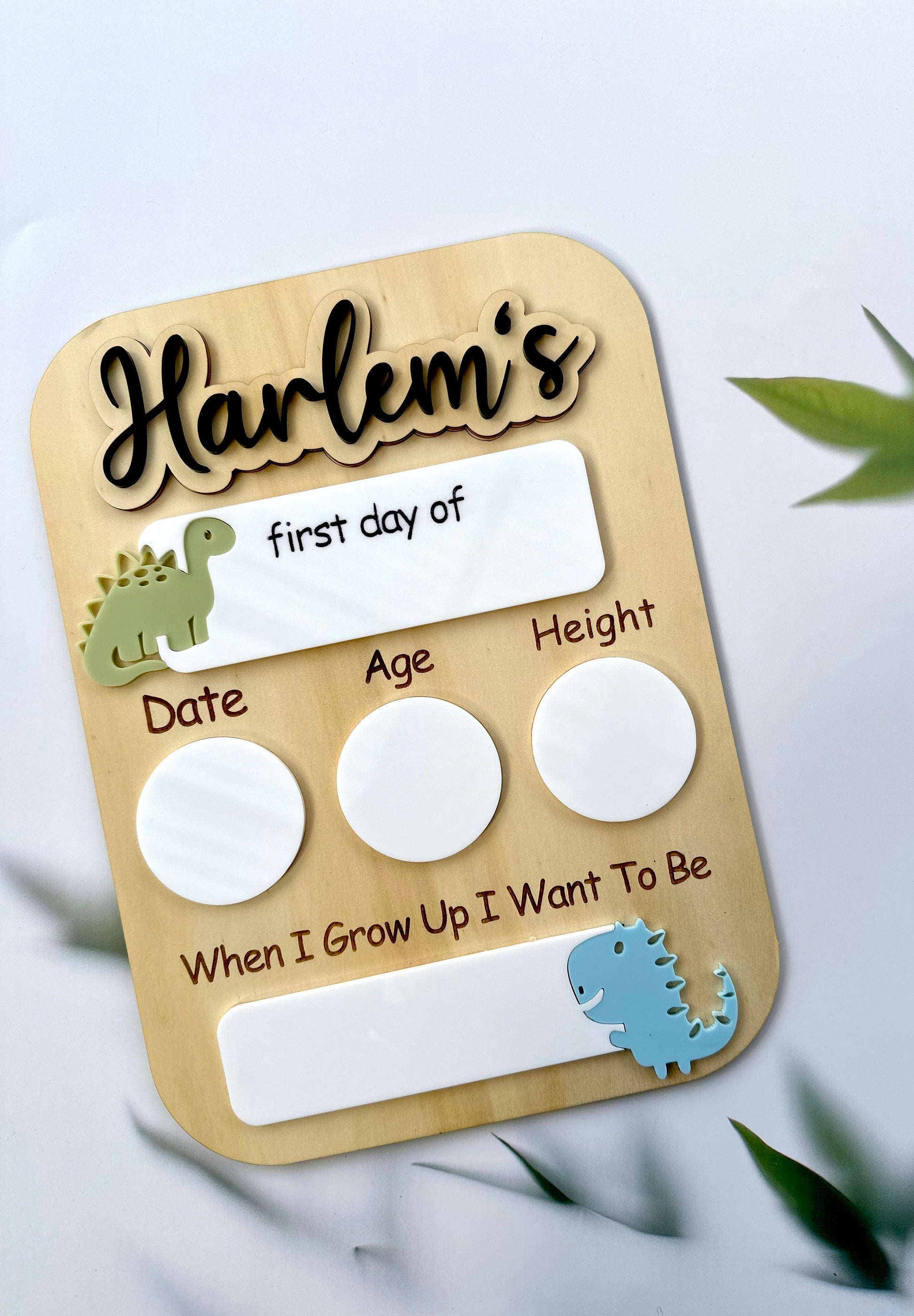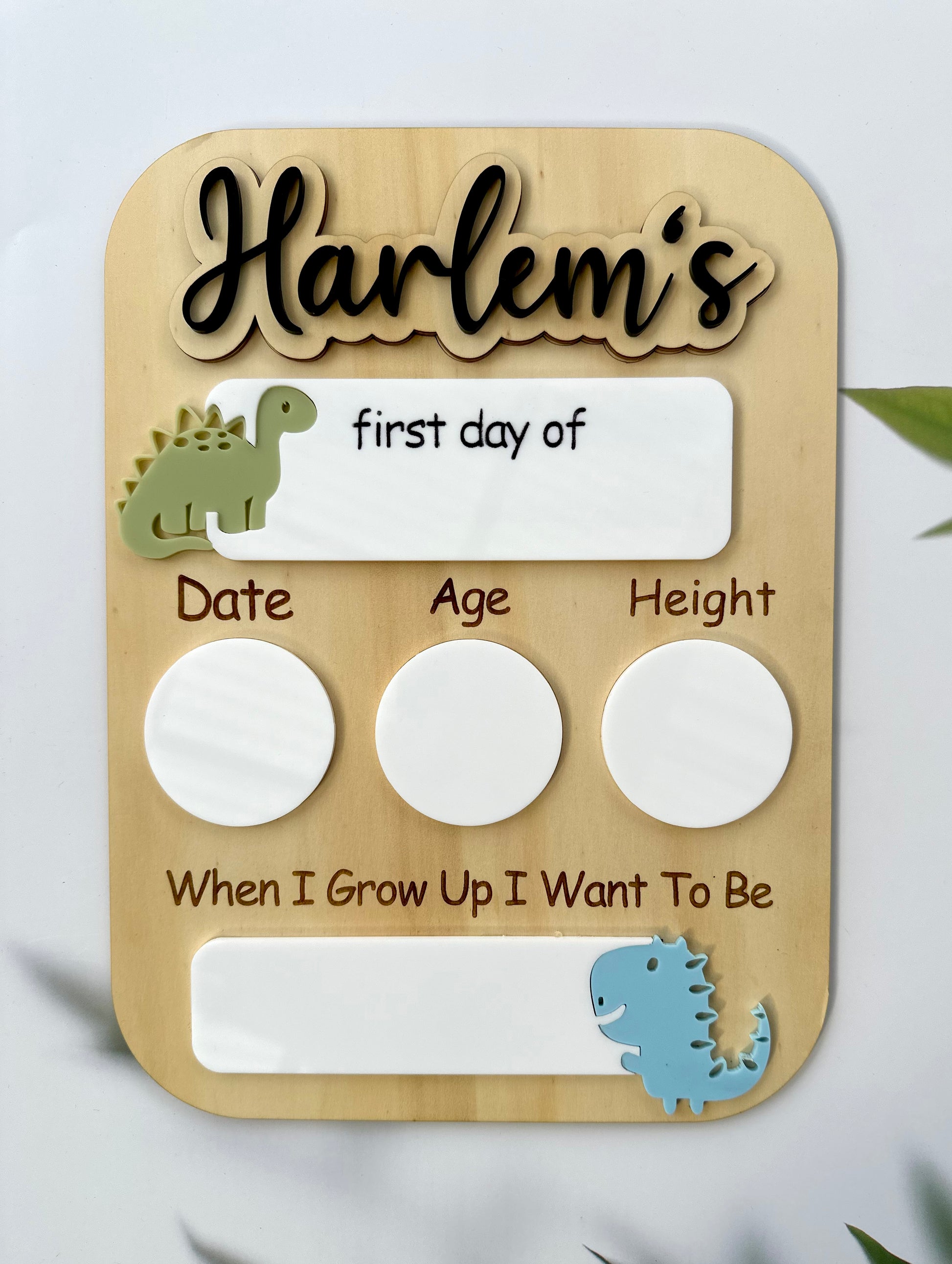 Each timber board is engraved with "Date, Age, Height & When I Grow Up I Want To Be" Below each of them is a section of white acrylic for you to write the information with a removeable marker (Not Included)